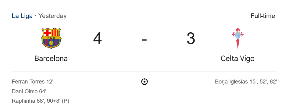 จาก : ผลบอลสด ลาลิกา 2025 ระหว่าง บาร์เซโลน่า 4-3 เซลต้า บีโก้ วันนี้ 19/4/68 – บ้านกีฬา