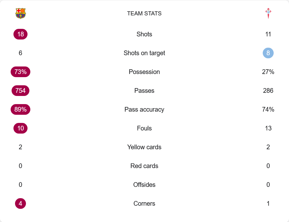 บาร์เซโลน่า มีโอกาสยิงทั้งหมด 18 ครั้ง เข้ากรอบ 6 ครั้ง ครองบอลถึง 73% ส่งบอลได้แม่นยำถึง 89% จากการผ่านบอล 754 ครั้ง ส่วนเซลต้า บีโก้ มีโอกาสยิง 11 ครั้ง เข้ากรอบถึง 8 ครั้ง แม้ครองบอลน้อยเพียง 27% แต่เกมโต้กลับทำได้หวือหวาไม่น้อย การเข้าทำของบาร์ซ่าแม่นยำกว่า แต่เกมรับยังมีจุดอ่อนที่ต้องเร่งแก้ไขอย่างเร่งด่วน