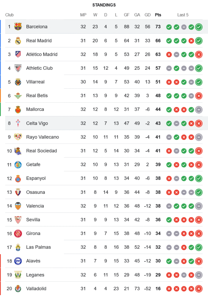 ชัยชนะนัดนี้ทำให้ บาร์เซโลน่า เก็บเพิ่มเป็น 73 แต้ม จาก 32 นัด ยึดตำแหน่งจ่าฝูงของ ลาลีกา ไว้อย่างเหนียวแน่น โดยนำห่าง เรอัล มาดริด อันดับสองอยู่ 7 แต้มเต็ม ส่วน เซลต้า บีโก้ แม้จะสู้ได้ยอดเยี่ยมแต่ยังอยู่ที่อันดับ 8 ของตาราง มี 43 แต้มตามหลังโซนยูโรป้าลีกอยู่เพียง 1 คะแนนเท่านั้น