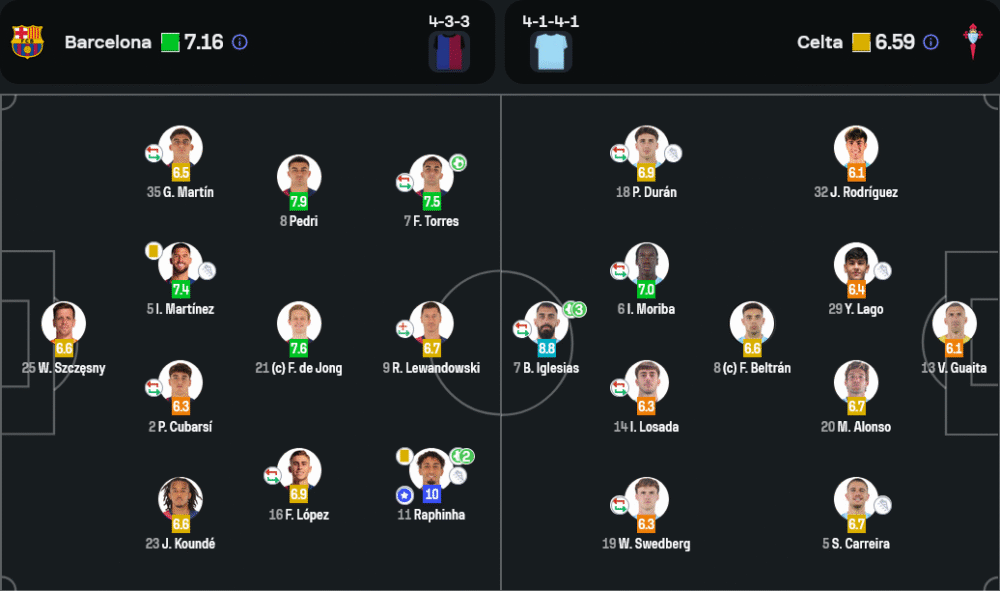 ราฟินญ่า คือพระเอกของเกมอย่างแท้จริง ด้วยฟอร์มการเล่นระดับ 10 เต็ม 10 กดสองประตูในช่วงเวลาสำคัญ รวมถึงจุดโทษในช่วงทดเจ็บนาทีที่ 90+8 ช่วยให้ บาร์เซโลน่า พลิกสถานการณ์เก็บสามแต้มสำคัญสุดระทึกได้สำเร็จ