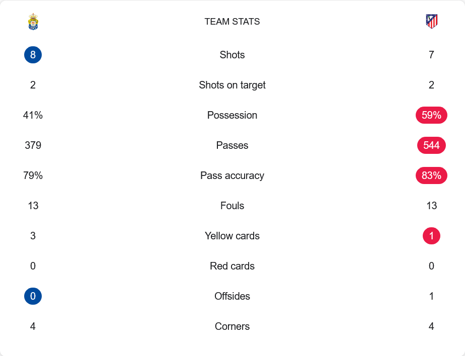 ตลอดเกมนี้ แอต.มาดริด ครองบอลมากกว่า 59% เทียบกับลาส พัลมาสที่มี 41% แต่โอกาสยิงใกล้เคียงกัน โดยลาส พัลมาสยิง 8 ครั้ง เข้ากรอบ 2 ครั้ง ส่วนแอต.มาดริดยิง 7 ครั้ง เข้ากรอบ 2 ครั้งเท่ากัน การผ่านบอล แอต.มาดริดเหนือกว่าอย่างชัดเจนที่ 544 ครั้ง ความแม่นยำ 83% ขณะที่ลาส พัลมาสผ่านบอล 379 ครั้ง ความแม่นยำ 79% เกมมีการฟาวล์เกิดขึ้นฝั่งละ 13 ครั้ง และใบเหลืองรวม 4 ใบ (ลาส พัลมาส 3 ใบ, แอต.มาดริด 1 ใบ)