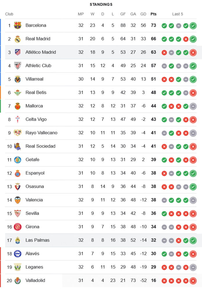 ชัยชนะนัดนี้ทำให้ ลาส พัลมาส เก็บเพิ่มเป็น 32 คะแนนจาก 32 นัด ยังรั้งอันดับ 17 แต่หนีห่างจากโซนตกชั้นเพิ่มขึ้นอีกเล็กน้อย ขณะที่แอตเลติโก้ มาดริด ยังอยู่อันดับ 3 มี 63 คะแนน แต่โดน เรอัล มาดริด และบาร์เซโลน่าทิ้งห่างมากขึ้น โอกาสลุ้นแชมป์แทบจะริบหรี่แล้วในตอนนี้