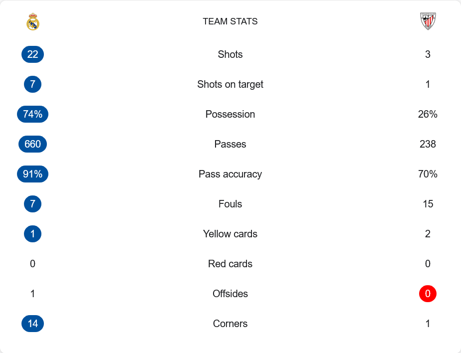 เรอัล มาดริดพับสนามบุกทั้งเกม ด้วยการสร้างโอกาสยิงถึง 22 ครั้ง ยิงตรงกรอบ 7 ครั้ง เทียบกับบิลเบาที่มีโอกาสยิงแค่ 3 ครั้ง และยิงเข้ากรอบเพียงครั้งเดียว ราชันชุดขาวครองบอล 74% และต่อบอลถึง 660 ครั้ง ด้วยความแม่นยำสูงถึง 91% ในขณะที่บิลเบาครองบอลเพียง 26% ต่อบอล 238 ครั้ง ด้วยความแม่นยำ 70% ส่วนลูกเตะมุม มาดริดได้ถึง 14 ครั้ง ขณะที่ทีมเยือนได้แค่ครั้งเดียวเท่านั้น