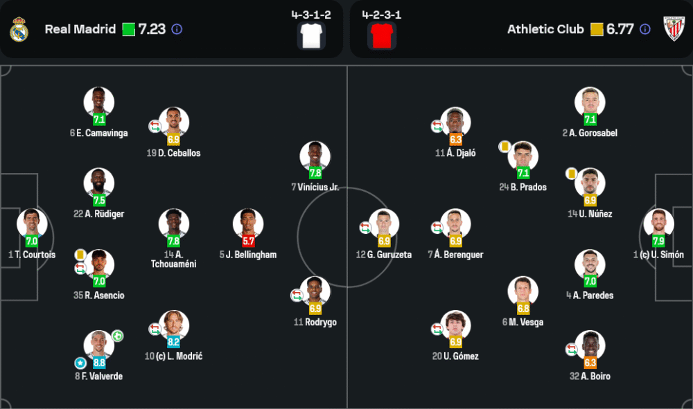 หากจะ วิเคราะห์บอล เกมนี้ เรอัล มาดริดโชว์ให้เห็นถึงความอดทนและสมาธิตลอด 90 นาที การครองบอลเหนือกว่าถึง 74% ช่วยให้พวกเขาคุมจังหวะเกมได้หมด บุกหลากหลายจากการวางบอลยาว การประสานงานริมเส้น และการทำชิ่งสั้นๆ จนทำให้แอธเลติก บิลเบาต้องถอยลึกไปตั้งรับสุดตัว ฝั่งบิลเบาเองมาในแผนตั้งรับแน่นหนา 4-2-3-1 เน้นแพ็กโซนหน้าประตูและรอโอกาสโต้กลับแต่แทบไม่มีโอกาสเลย ความแตกต่างชัดเจนที่สุดอยู่ที่คุณภาพในการสร้างสรรค์เกมรุก และการเคลื่อนบอลที่ไหลลื่นของมาดริด