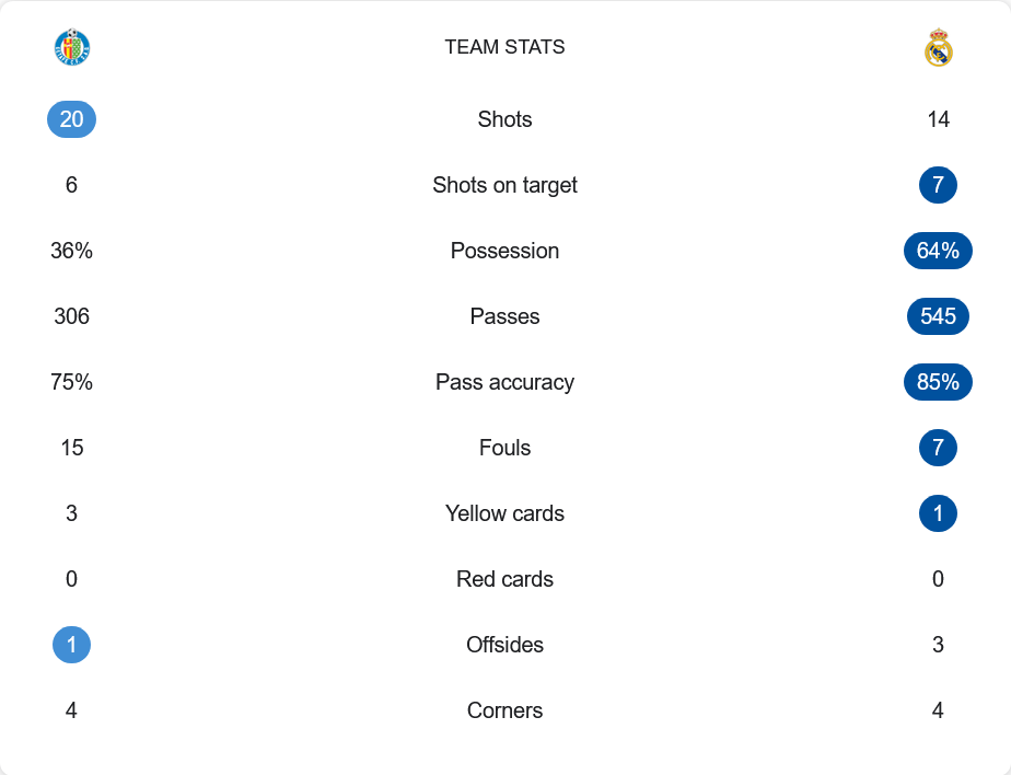 เรอัล มาดริด ครองบอลถึง 64% พร้อมผ่านบอล 545 ครั้งด้วยความแม่นยำ 85% แสดงให้เห็นถึงการคุมเกมที่ยอดเยี่ยม ต่างจากเกตาเฟ่ที่แม้จะยิงมากกว่าถึง 20 ครั้ง แต่เข้ากรอบแค่ 6 และมีเปอร์เซ็นต์การครองบอลเพียง 36% จังหวะโต้กลับของเจ้าบ้านพอมีให้ลุ้น แต่ยังขาดความแม่นยำ ขณะที่การเล่นของราชันเน้นความแน่นอนและจบสกอร์ได้อย่างเด็ดขาดจากโอกาสเพียงไม่กี่ครั้ง