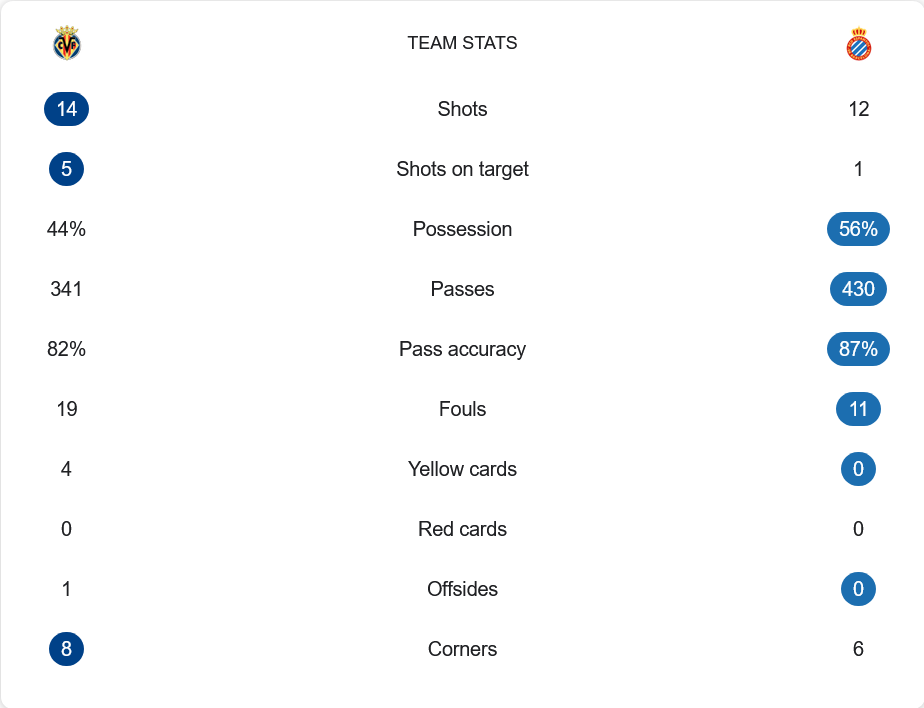แม้บียาร์เรอัลจะครองบอลน้อยกว่า (44%) แต่กลับมีโอกาสยิงมากกว่า โดยยิงไปทั้งหมด 14 ครั้ง เข้ากรอบ 5 ครั้ง ส่วนเอสปันญ่อลแม้ครองบอลได้ถึง 56% แต่มีโอกาสยิงเพียง 12 ครั้ง เข้ากรอบแค่ 1 ครั้งเท่านั้น การผ่านบอลของเอสปันญ่อลแม่นยำถึง 87% จาก 430 ครั้ง ส่วนบียาร์เรอัลจ่ายแม่น 82% จาก 341 ครั้ง เกมนี้มีการฟาวล์ค่อนข้างเยอะโดยเฉพาะฝั่งเจ้าบ้านที่ทำฟาวล์ถึง 19 ครั้ง แต่ไม่มีใบแดงเกิดขึ้น เตะมุมบียาร์เรอัลได้ 8 ครั้งมากกว่าเอสปันญ่อลที่ได้ 6 ครั้ง