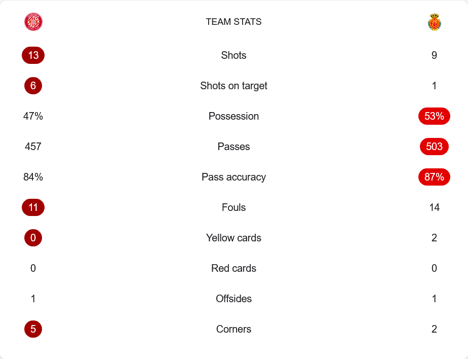 แม้ มายอร์ก้า จะครองบอลมากถึง 53% และมีการผ่านบอลมากถึง 503 ครั้ง แต่พวกเขากลับยิงตรงกรอบได้เพียงครั้งเดียวจากทั้งหมด 9 ครั้ง ขณะที่คิโรน่ายิงทั้งหมด 13 ครั้ง ตรงกรอบ 6 ครั้ง แสดงถึงความอันตรายในการเข้าทำ นอกจากนี้ คิโรน่ามีลูกเตะมุมมากกว่า (5 ครั้ง) ขณะที่มายอร์ก้าได้แค่ 2 หน การตัดเกมมีบ้างแต่ไม่รุนแรงจนถึงใบแดง โดยทีมเยือนได้ใบเหลือง 2 ใบจากการฟาวล์หนักในช่วงท้ายเกม