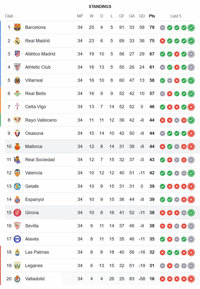 ชัยชนะเกมนี้ทำให้ คิโรน่า ขยับขึ้นมามี 38 คะแนนจาก 35 นัด อยู่ในอันดับที่ 15 ห่างจากโซนตกชั้นพอสมควรและมีลุ้นอยู่รอดต่อไป ขณะที่ มายอร์ก้า พลาดโอกาสทำแต้มขยับขึ้นอันดับ 8 โดยยังคงมี 44 คะแนนจาก 34 นัดเท่ากับโอซาซูน่าและรัยโย บาเยกาโน่ แต่มีผลต่างประตูได้เสียน้อยกว่า