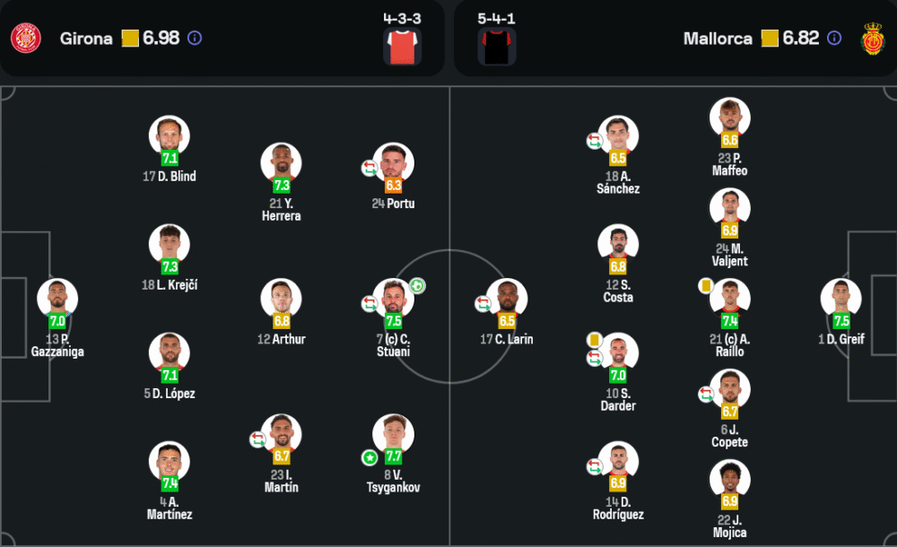 ในแง่ วิเคราะห์บอล เกมนี้ คิโรน่า ใช้ระบบ 4-3-3 ที่เน้นการเล่นริมเส้นและการเข้าทำเร็ว จุดแข็งอยู่ที่การประสานงานระหว่าง ซีกานคอฟ และ สตูอานี่ ซึ่งใช้ประสบการณ์สูงในการหลุดกับดักล้ำหน้าและจบสกอร์อย่างเฉียบคม ส่วนแผงกลางและแนวรับทำหน้าที่ได้อย่างมีวินัย แม้จะเสียการครองบอลให้มายอร์ก้าแต่ไม่เสียรูปเกม