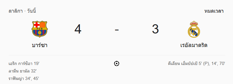 นี่คือหนึ่งในเกม เอล กลาซิโก้ ที่เข้มข้นที่สุดในยุคหลัง ทั้งสองทีมเล่นเกมรุกแบบไม่มีเบรก โดยเฉพาะ คีเลียน เอ็มบัปเป้ ที่กดแฮตทริกให้ราชัน แต่ความเฉียบขาดของ ราฟินญ่า และ ยามาล คือจุดเปลี่ยนสำคัญให้ บาร์เซโลน่า เก็บสามแต้มสุดระทึก ด้าน VAR ปฏิเสธประตูที่ห้าในช่วงทดเจ็บ เรียกเสียงเฮ (และโห่) ทั่วสนาม!