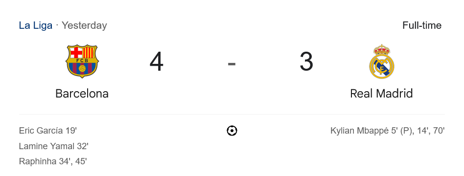 เข้าสู่ครึ่งหลัง แม้ว่า เอ็มบั๊ปเป้ จะมาเบิ้ลแฮตทริกนาที 70 ไล่มาเป็น 4-3 แต่แนวรับบาร์ซ่ายืนหยัดเหนียวแน่นช่วยกันต้านทุกการบุกของมาดริดไว้ได้ เกมมีจังหวะป่วน VAR ปฏิเสธจุดโทษให้ราชัน และประตูของ เฟร์มิน โลเปซ ถูกยกเลิกช่วงท้าย ทว่าเสียงนกหวีดยาวดังขึ้นด้วยชัยชนะของเจ้าบุญทุ่มอย่างสมศักดิ์ศรี