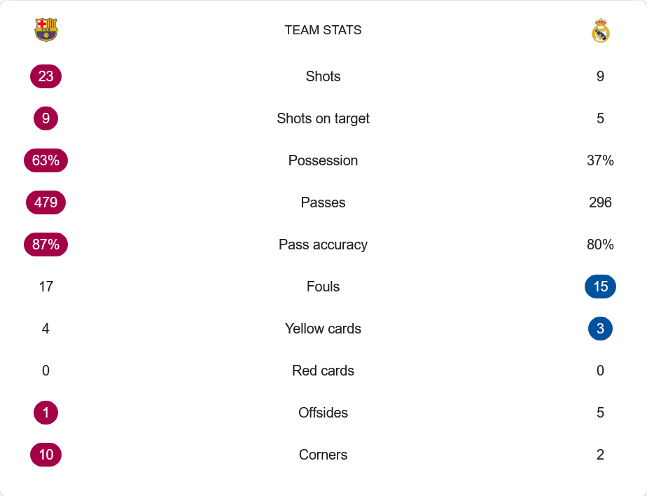บาร์เซโลน่าเป็นฝ่ายครองเกมได้ดีกว่าชัดเจนโดยมีเปอร์เซ็นต์การครองบอล 63% เทียบกับมาดริดที่ได้เพียง 37% ตลอดทั้งเกม บาร์ซ่าทำได้ 23 ครั้งในการยิง และเข้ากรอบถึง 9 ขณะที่มาดริดมีเพียง 9 ครั้ง เข้ากรอบ 5 เท่านั้น จำนวนการจ่ายบอลก็เหนือกว่าโดยบาร์ซ่าจ่าย 479 ครั้ง ความแม่นยำ 87% ส่วนราชันชุดขาวทำได้ 296 ครั้งแม่นยำ 80% เกมมีใบเหลืองทั้งหมด 7 ใบ โดยบาร์ซ่าโดน 4 และมาดริดอีก 3