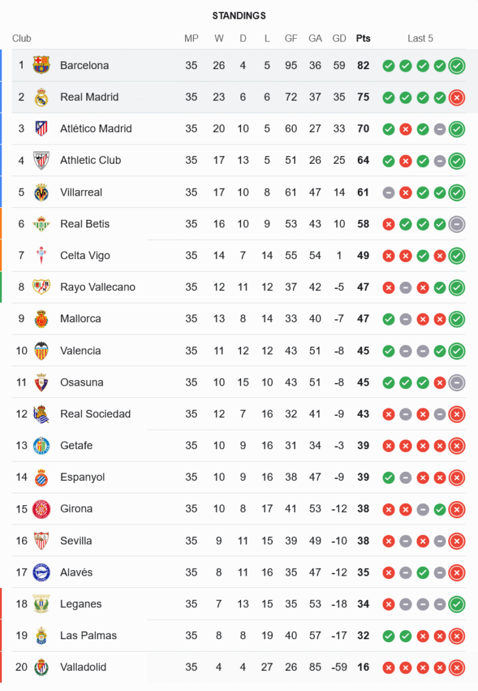 ชัยชนะนัดนี้ส่งผลให้ บาร์เซโลน่า รั้งจ่าฝูงเหนียวแน่นที่ 82 แต้มจาก 35 นัด ทิ้งห่าง เรอัล มาดริด ที่ตามหลังอยู่ 7 แต้มเต็มและมีแต้มให้ลุ้นอีกเพียง 3 เกมเท่านั้น โอกาสคว้าแชมป์เริ่มชัดเจนขึ้นทุกขณะ ขณะที่มาดริดแม้จะฟอร์มร้อนแรงจากเอ็มบั๊ปเป้ แต่พลาดเกมสำคัญนี้ ทำให้การลุ้นแชมป์ดูริบหรี่ลงทุกที