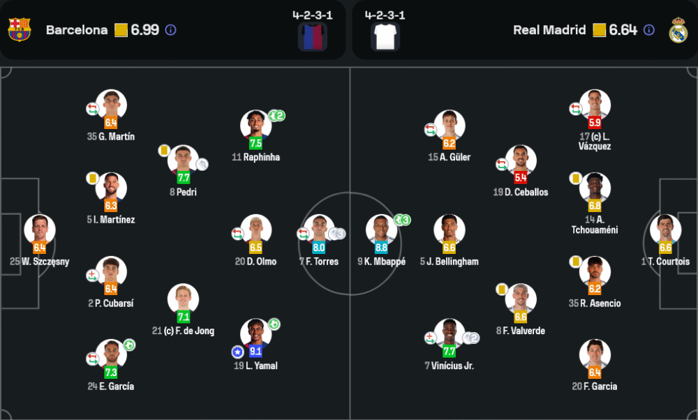 รูปแบบการเล่นของทั้งสองทีมเปิดหน้าแลกกันชนิดไม่กลัวตาย บาร์เซโลน่า มาในระบบ 4-2-3-1 ที่เน้นการครองบอลและกระจายเกมรุกผ่านแดนกลาง โดยมีเปดรีเป็นคนคุมจังหวะ และยามาลรับบทตัวทะลุทะลวงซ้ายขวาได้อันตรายทุกจังหวะ แดนหลังแม้จะมีช่องโหว่บ้างแต่เชสนี่เซฟจังหวะสำคัญได้