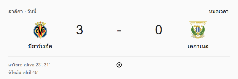 แมตช์ที่แฟนบอลเจ้าบ้านต้องจำไปอีกนาน เมื่อ บียาร์เรอัล เปิดบ้านยิงกระหน่ำใส่ เลกาเนส แบบไม่ยั้งตั้งแต่ครึ่งแรก โดยได้สองประตูจาก อาโยเซ่ เปเรซ และลูกปิดกล่องของ นิโคลัส เปเป้ ปิดบัญชีก่อนพักครึ่ง แถมครองเกมเหนียวแน่นจนเลกาเนสไม่มีช่องให้ลุ้น ทำให้เกมนี้กลายเป็นหนึ่งในไฮไลต์ของค่ำคืนนี้ที่แฟนบอลตามติด ผลบอลสด กันแบบนาทีต่อนาที
