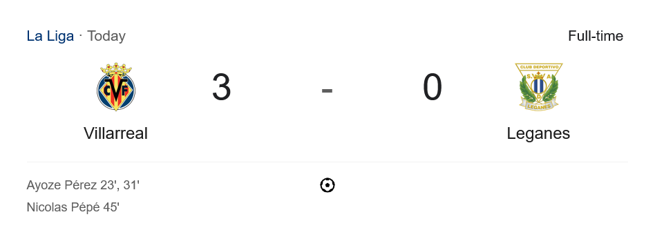 ⚽ 45′ นิโกลาส์ เปเป้ ยิงประตูที่สามให้บียาร์เรอัลนำห่าง 3-0 (แอสซิสต์: บาเอน่า)