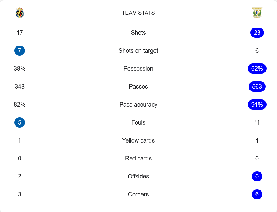 เลกาเนสครองบอลเหนือกว่าชัดเจนถึง 62% พร้อมกับการผ่านบอลมากถึง 563 ครั้ง และมีความแม่นยำสูงถึง 91% ขณะที่เจ้าบ้านอย่างบียาร์เรอัล ครองบอลเพียง 38% แต่จ่ายบอลเพียง 348 ครั้ง แม่นยำ 82% เท่านั้น อย่างไรก็ตาม จำนวนการยิงของเลกาเนสแม้จะมากถึง 23 ครั้ง แต่ตรงกรอบแค่ 6 ขณะที่เจ้าบ้านยิงไป 17 ครั้ง ตรงกรอบ 7 และเปลี่ยนเป็นประตูได้ถึง 3 ลูก บอกชัดว่าบียาร์เรอัลมีความเฉียบขาดมากกว่า ฟาวล์น้อยกว่าเพียง 5 ครั้งเทียบกับ 11 ของเลกาเนส และลูกเตะมุมทีมเยือนก็ได้มากกว่าเช่นกัน 6 ต่อ 3