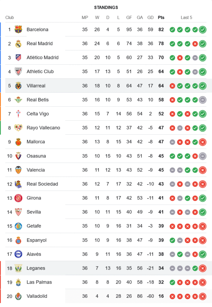 ชัยชนะในเกมนี้ส่งผลให้ บียาร์เรอัล เก็บเพิ่มเป็น 64 แต้มจาก 36 นัด ขึ้นอันดับ 5 มีแต้มเท่ากับ แอธเลติก คลับ และลุ้นแย่งโควตายุโรปเต็มตัว ส่วน เลกาเนส ยังจมโซนแดงอยู่อันดับ 18 มี 34 แต้ม ห่างจากโซนปลอดภัย 4 คะแนน และเหลือโปรแกรมเพียงอีก 2 นัดให้ดิ้นรนหนีตกชั้น