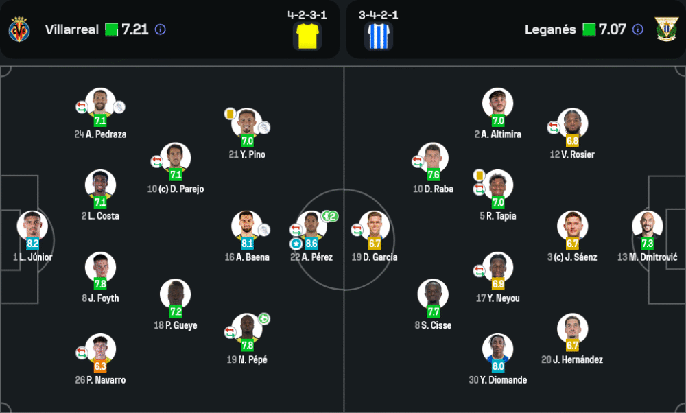 🏆 อโยเซ่ เปเรซ (บียาร์เรอัล) ดาวยิงที่โชว์ฟอร์มเกินต้าน ยิง 2 ประตูในครึ่งแรก สร้างความมั่นใจและแรงกระตุ้นให้ทีม พาบอลพุ่งทะยานลุ้นพื้นที่ยุโรปอย่างสมศักดิ์ศรี รับคะแนนสูงสุด 8.6