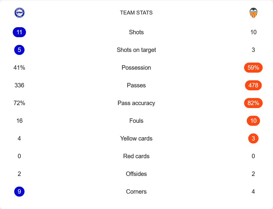 บาเลนเซียครองบอลได้ถึง 59% เทียบกับ 41% ของอลาเบส และจ่ายบอลมากถึง 478 ครั้งด้วยความแม่นยำ 82% ขณะที่เจ้าถิ่นจ่ายเพียง 336 ครั้ง แม่นยำ 72% ถึงแม้ตัวเลขการครองบอลจะเทไปทางทีมเยือน แต่อลาเบสยิงตรงกรอบถึง 5 ครั้งจาก 11 หน ในขณะที่บาเลนเซียมีแค่ 3 ครั้งจาก 10 หนเท่านั้น ด้านลูกเตะมุมอลาเบสได้มากถึง 9 ครั้ง เทียบกับ 4 ของทีมเยือน เกมนี้ยังมีใบเหลืองกันถึง 7 ใบ แบ่งเป็น อลาเบส 4 ใบ บาเลนเซีย 3 ใบ
