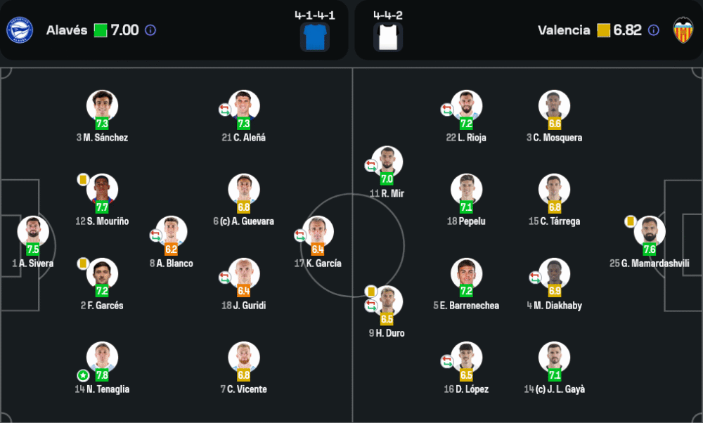 🏆 นาฮูเอล เตนาญ่า (อลาเบส) แบ็กขวาจอมลุยของเจ้าถิ่นโชว์ฟอร์มได้โดดเด่นทั้งเกมรุกและรับ เติมเกมขึ้นสุดลงสุด มีจังหวะตัดบอลเด็ดขาดหลายครั้ง พร้อมคุมพื้นที่ฝั่งขวาจนแนวรุกบาเลนเซียแทบทำอะไรไม่ได้ ได้คะแนนสูงสุดในเกมนี้ที่ 7.8