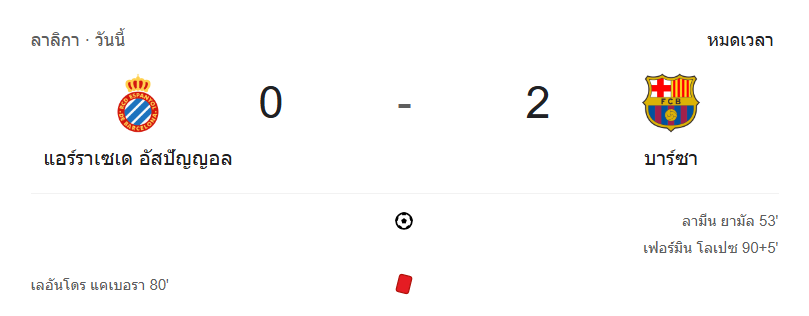 - นาทีที่ 86: Lamine Yamal มีโอกาสยิงจ่อๆ กลางเขตโทษ แต่ถูกผู้รักษาประตูเอสปัญญอลเซฟไว้