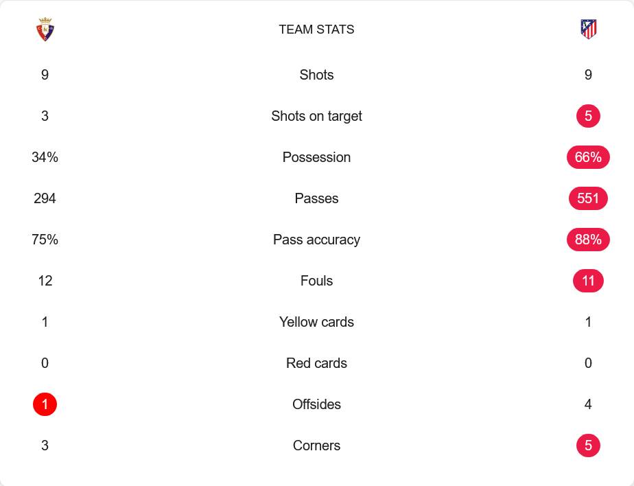 แม้แอตฯมาดริดจะครองบอลถึง 66% และมีโอกาสยิงรวมเท่ากับเจ้าบ้านคือ 9 ครั้ง แต่จังหวะที่แม่นยำมีเพียง 5 ครั้งเท่านั้น ขณะที่โอซาซูน่าแม้จะครองบอลน้อยเพียง 34% แต่สามารถแปรเปลี่ยนการครองบอลให้กลายเป็นประตูได้ถึงสองครั้ง เกมนี้แสดงให้เห็นถึงประสิทธิภาพของเกมสวนกลับและความแม่นยำในการเข้าทำของเจ้าบ้านได้อย่างชัดเจน ส่วนจำนวนการส่งบอลฝั่งแอตฯอยู่ที่ 551 ครั้ง เทียบกับโอซาซูน่าที่มีแค่ 294 ครั้ง แต่เปอร์เซ็นต์ความแม่นยำยังห่างกันชัดที่ 88% ต่อ 75%