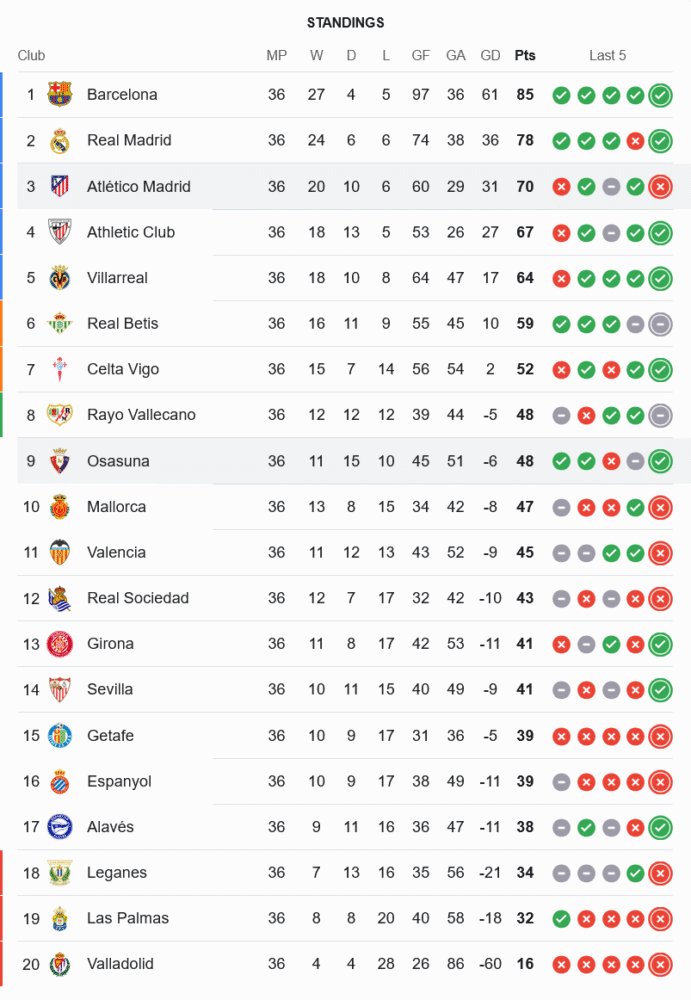 ชัยชนะเกมนี้ส่งให้โอซาซูน่าทะยานขึ้นมารั้งอันดับ 9 ของตาราง มี 48 คะแนน เท่ากับ ราโย บาเยกาโน่ แต่ลูกได้เสียน้อยกว่า ถือเป็นก้าวกระโดดที่สำคัญในช่วงโค้งสุดท้ายของฤดูกาล ขณะที่แอตเลติโก้ มาดริด ยังอยู่ที่อันดับ 3 มี 70 แต้ม แม้จะไม่หลุดโควตา UCL แต่ก็สะเทือนใจไม่น้อยกับความพ่ายแพ้แบบไร้ทางสู้