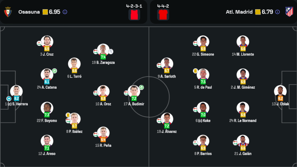 กองกลาง: โรดริโก้ เด ปอล (7.5), โกเก้ (7.0), ปาโบล บาร์ริออส (6.9), จูเลียน อัลวาเรซ (7.2)