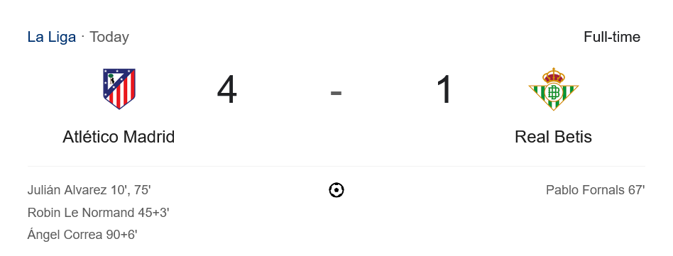 ครึ่งหลังเบติสยังไม่ยอมง่าย ๆ และมาได้ประตูตีไข่แตกจาก ปาโบล ฟอร์นัลส์ นาทีที่ 67 จุดประกายความหวังให้ทีมเยือนเล็ก ๆ แต่แอตเลติโก้ มาดริด กลับมาตอกฝาโลงทันทีในนาทีที่ 75 จากลูกยิงสุดคมของอัลวาเรซอีกครั้ง ก่อนที่ อังเคล คอร์เรอา จะมาซัดปิดกล่องช่วงทดเวลาบาดเจ็บนาที 90+6 พาทีมเปิดบ้านถล่มเบติสไปขาดลอย 4-1 อย่างสะใจแฟน ๆ ในสนาม
