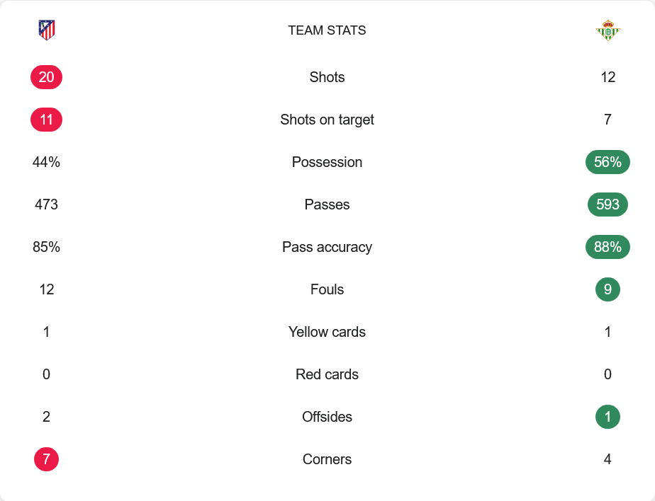 แม้สกอร์จะขาดลอย แต่ในภาพรวมถือว่าเกมนี้เบติสไม่ได้แพ้ขาดในด้านสถิติ เพราะพวกเขาครองบอลได้มากกว่าถึง 56% และจ่ายบอลแม่นยำถึง 88% จากจำนวน 593 ครั้ง ขณะที่แอตฯ มาดริดครองบอล 44% และจ่ายบอลสำเร็จ 85% จาก 473 ครั้ง อย่างไรก็ตามเจ้าถิ่นมีโอกาสยิงถึง 20 ครั้ง และเข้ากรอบถึง 11 เทียบกับเบติสที่ยิง 12 เข้ากรอบ 7 ซึ่งชี้ชัดว่าเกมรุกของแอตฯ มาดริดเฉียบขาดกว่า ส่วนจังหวะเตะมุมเป็นเจ้าถิ่นที่ได้มากกว่าถึง 7 ครั้งเทียบกับเบติสที่ได้เพียง 4 ครั้ง