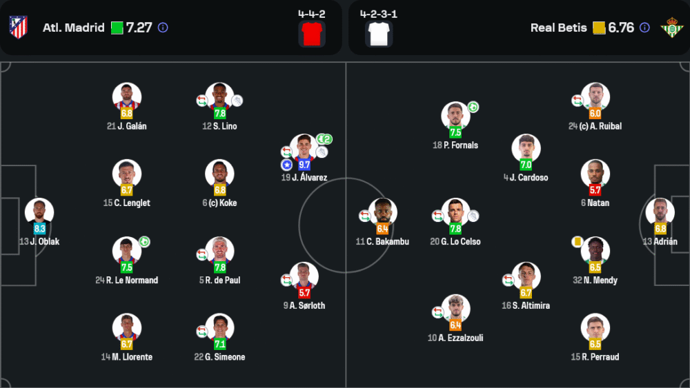 เกมนี้ แอตเลติโก้ มาดริด มาในระบบ 4-4-2 ที่เน้นการเพรสซิ่งหนักและฉวยโอกาสจากเกมสวนกลับ ซึ่งได้ผลอย่างชัดเจนเมื่อพวกเขาสร้างโอกาสยิงถึง 20 ครั้งและเข้ากรอบถึง 11 ครั้ง ด้วยความเฉียบคมของอัลวาเรซและการสนับสนุนจากเด ปอลและลิโน่ ทำให้เกมรุกดูอันตรายตลอดเวลา ด้านเกมรับ โอบลัคคุมแนวหลังได้ยอดเยี่ยม ปิดมุมได้หลายจังหวะสำคัญ