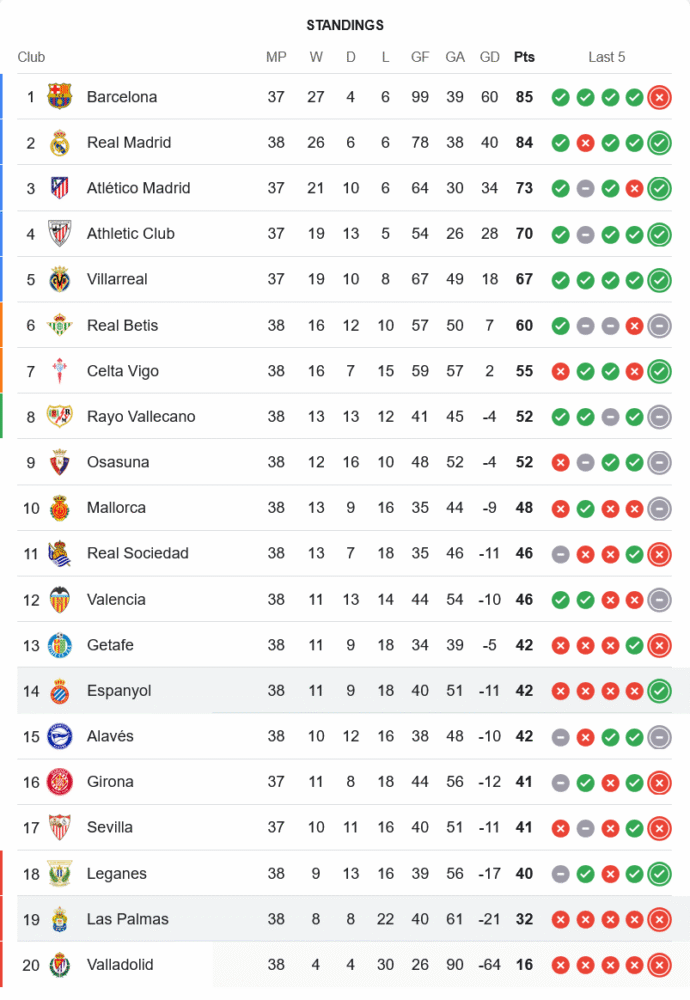 ลาลีกาได้ปิดฉากฤดูกาลลงเรียบร้อยแล้ว ทั้งสองทีมจะพักยาวและกลับมาอีกครั้งในฤดูกาลหน้า แฟนบอลสามารถติดตามความเคลื่อนไหวตลอดช่วงปรีซีซั่น และรอดูอัปเดต ตารางบอล ได้ที่เว็บไซต์ บ้านกีฬา