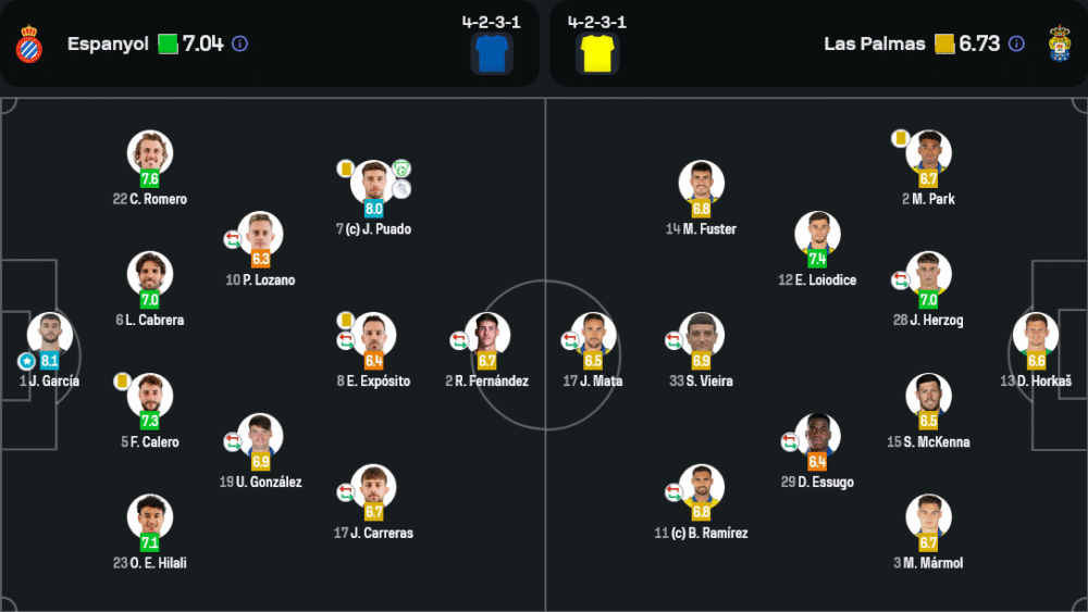 โจน การ์เซีย นายด่านของเอสปันญ่อลโชว์ฟอร์มสุดยอด คอยเซฟจังหวะสำคัญหลายครั้ง ช่วยทีมไม่ให้เสียประตูแม้โดนบุกต่อเนื่องตลอดครึ่งแรกและต้นครึ่งหลัง ได้เรตติ้งสูงสุด 8.1 ถือเป็นหัวใจหลักของชัยชนะในนัดนี้
