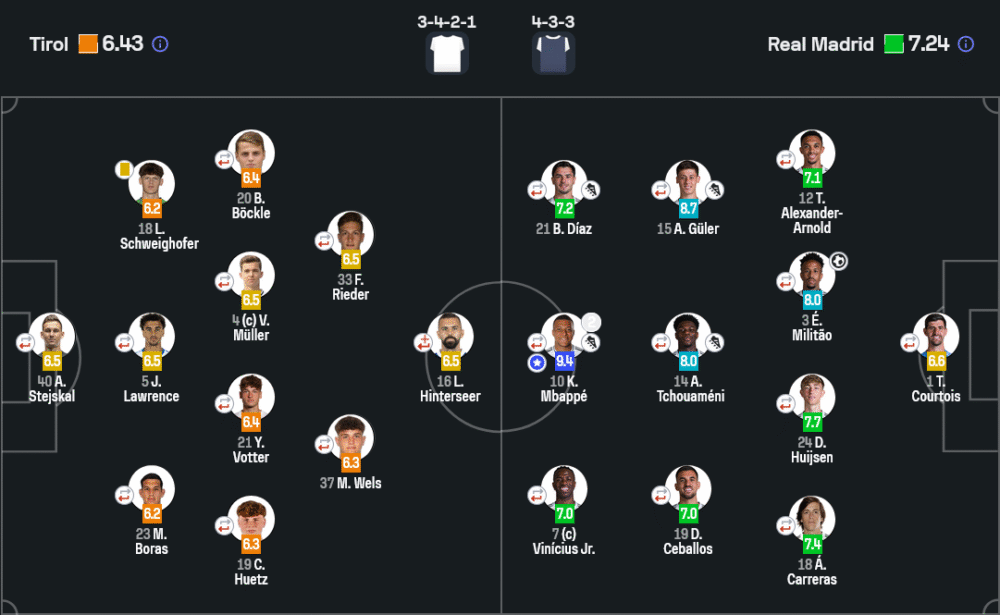 FW: A. Güler (8.7) → 83’ R. M. Uruel (6.8), K. Mbappé (9.4) → 83’ T. Pitarch (6.8), Vinícius Jr. (7.0) → 62’ Rodrygo (7.6)