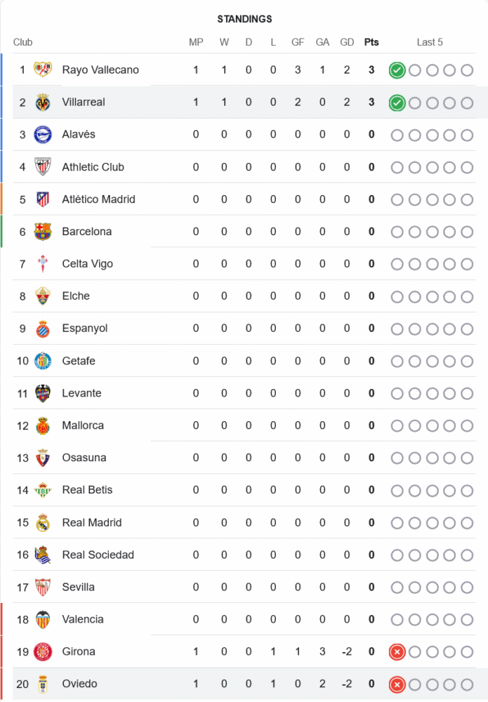 บียาร์เรอัล มีคิวพบ กิโรน่า ในวันที่ 25 สิงหาคม ก่อนเจอกับ เซลต้า บีโก้ วันที่ 31 สิงหาคม ส่วน เรอัล โอเบียโด ต้องเจอศึกหนักติดต่อกัน พบ เรอัล มาดริด ในวันที่ 25 สิงหาคม และต่อด้วย เรอัล โซเซียดาด วันที่ 31 สิงหาคม แฟนบอลสามารถติดตาม ตารางบอล และผลการแข่งขันได้ที่ บ้านกีฬา