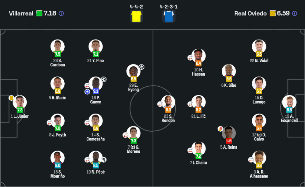 บียาร์เรอัล ใช้ระบบ 4-4-2 ที่เน้นความแข็งแกร่งแดนกลาง การเล่นของ เกย์ และ โกเมซาญ่า ช่วยให้ทีมครองเกมได้ทั้งหมด การโจมตีทางริมเส้นจาก ปิโน่ และ คาร์โดน่า ทำให้แนวรับ โอเบียโด โดนกดดันตลอด 90 นาที จุดเด่นคือการเพรสซิ่งสูงและการเปลี่ยนเกมเร็วที่ทำให้คู่แข่งตั้งตัวไม่ทัน