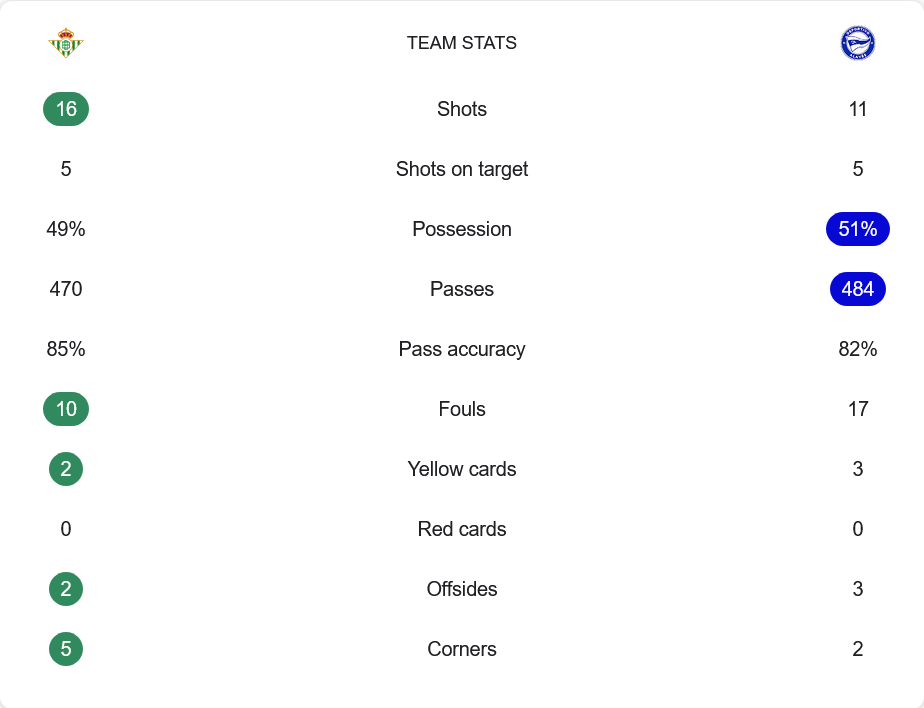 รูปเกมชัดเจนว่า เบติสใช้แผน 4-2-3-1 ครองบอลน้อยกว่าเพียงเล็กน้อย แต่การเข้าทำอันตรายมากกว่า โดยมี โล เซลโซ คุมเกมรุกและ ฟอร์นาลส์ คอยเชื่อมตรงกลาง ส่วนอลาเบสยืน 4-4-2 วางเกมรับหนาแน่นเน้นรอโต้กลับ แต่ปัญหาคือความแม่นยำในการจบสกอร์ยังไม่ดีพอ แม้จะครองบอลได้ใกล้เคียง (49% ต่อ 51%) แต่ถูกบีบจนเสียบอลบ่อย เมื่อเทียบกัน เบติสมีความลงตัวมากกว่าในจังหวะสุดท้าย