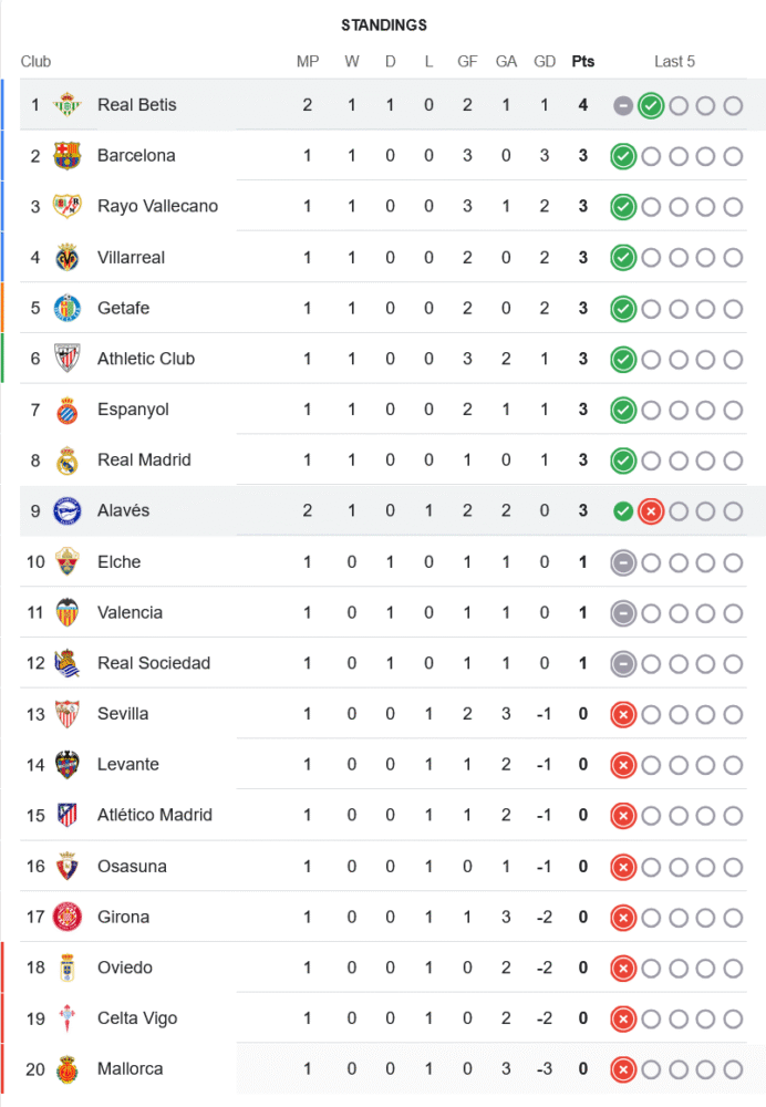 ชัยชนะนัดนี้ทำให้ เรอัล เบติส เก็บเพิ่มเป็น 4 คะแนน จาก 2 นัด ขึ้นนำจ่าฝูงชั่วคราว ส่วนอลาเบสมี 3 แต้มจาก 2 เกม รั้งอันดับ 9 เกมนี้มีผลอย่างยิ่งต่อความมั่นใจของเบติสก่อนเจอศึกหนักในโปรแกรมถัดไป