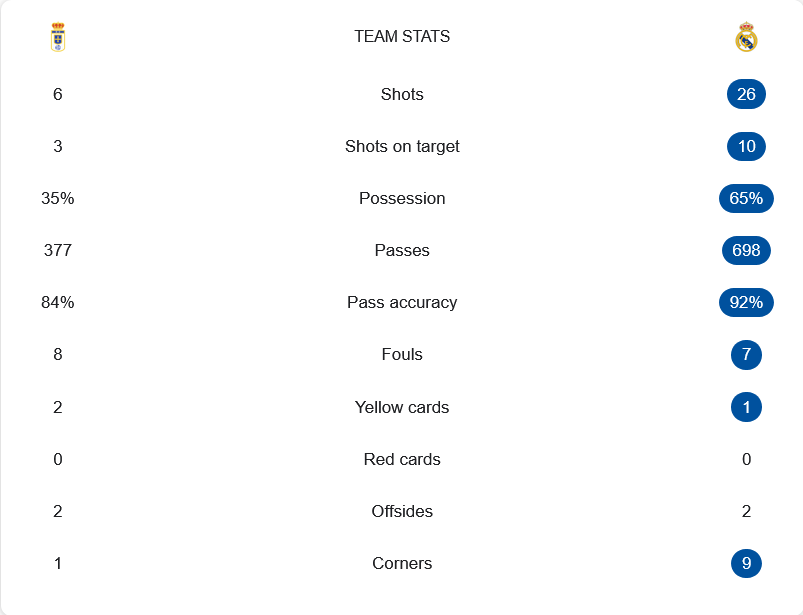 ตัวเลขชี้ชัดว่าเกมนี้มาดริดครองบอล 65% ยิงทั้งหมด 26 ครั้ง เข้ากรอบ 10 ส่วนโอเบียโดมีเพียง 6 ครั้ง เข้ากรอบ 3 การจ่ายบอลฝั่งทีมเยือนมากถึง 698 ครั้ง แม่นยำถึง 92% ขณะที่โอเบียโดจ่ายเพียง 377 ครั้งแม่นยำ 84% การเข้าปะทะและฟาวล์ค่อนข้างใกล้เคียง แต่ใบเหลืองเป็นของเจ้าถิ่น 2 ใบ ขณะที่มาดริดโดน 1 ใบ มุมเตะก็ชี้ให้เห็นถึงการบุกต่อเนื่องของทีมเยือนที่ได้ถึง 9 ครั้ง เทียบกับเจ้าถิ่นเพียง 1 ครั้ง