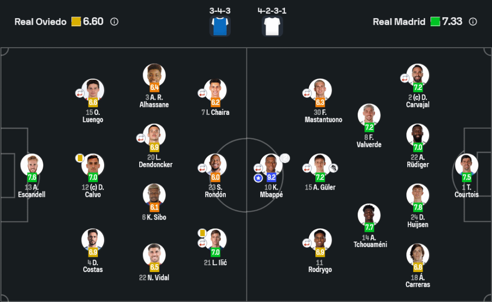 ในมุม วิเคราะห์บอล เกมนี้ชัดเจนว่าแผนการครองบอลของเรอัล มาดริดได้ผลเต็มร้อย การต่อบอล 698 ครั้งและความแม่นยำ 92% แสดงถึงความเหนือชั้นในการครองเกม ขณะที่โอเบียโดแม้จะวางแผนตั้งรับลึก แต่กลับถูกเจาะจากความเร็วและการเคลื่อนไหวของเอ็มบัปเป้และวินิซิอุสอยู่ตลอด การเปลี่ยนตัวส่งวินิซิอุสลงมาก็ยิ่งทำให้แนวรุกของราชันมีพิษสงมากขึ้น ส่วนโอเบียโดแม้พยายามใช้เกมสวนกลับ แต่การยิงเพียง 6 ครั้ง (ตรงกรอบ 3) ไม่มากพอจะทำให้กูร์กตัวส์เจองานยาก