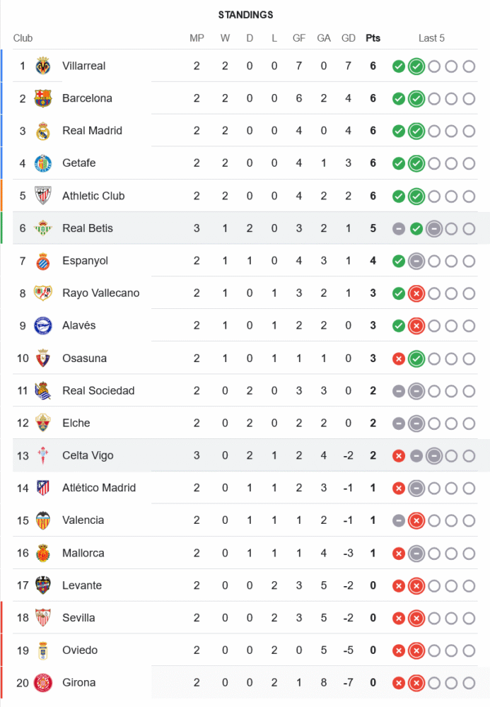 เซลต้าจะเปิดบ้านรับการมาเยือนของ กิโรน่า ในวันที่ 14 กันยายน เวลา 19.00 น. ตาม ตารางบอล ขณะที่เรอัล เบติส ต้องออกไปเยือน เลบานเต้ ในวันที่ 13 กันยายน เวลา 21.15 น. สองเกมนี้ถือว่าสำคัญทั้งคู่เพราะอาจกำหนดทิศทางอันดับในตารางช่วงต้นฤดูกาล