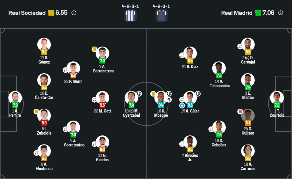 • กองกลาง: ชูอาเมนี (7.5), เซบาญอส (7.6), อาร์ด้า กูลาร์ (8.6), บราฮิม ดิอาซ (6.5), วินิซิอุส จูเนียร์ (6.5)