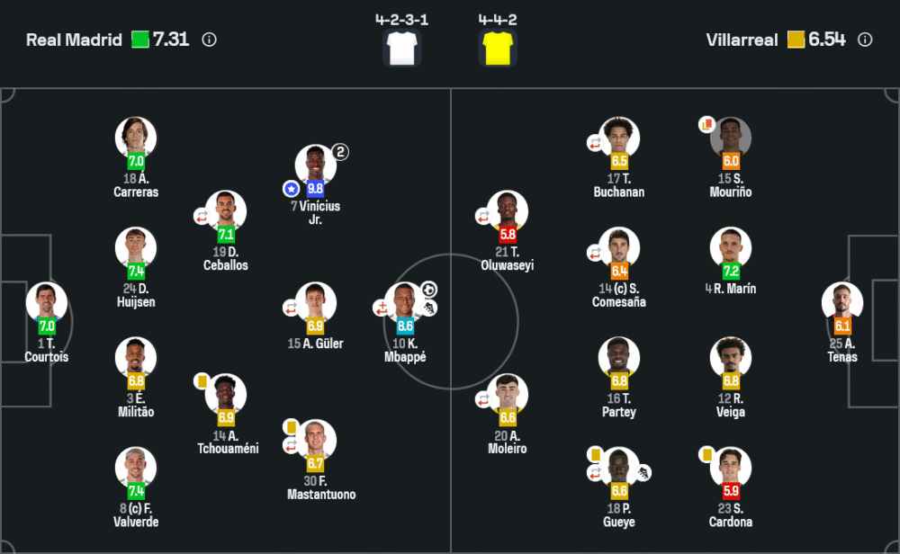 ตัวสำรอง: เอดูอาร์โด คามาแวงก้า (6.8), จู๊ด เบลลิงแฮม (7.4), บราฮิม ดิอาซ (6.8), โรดรีโก้ (7.1)