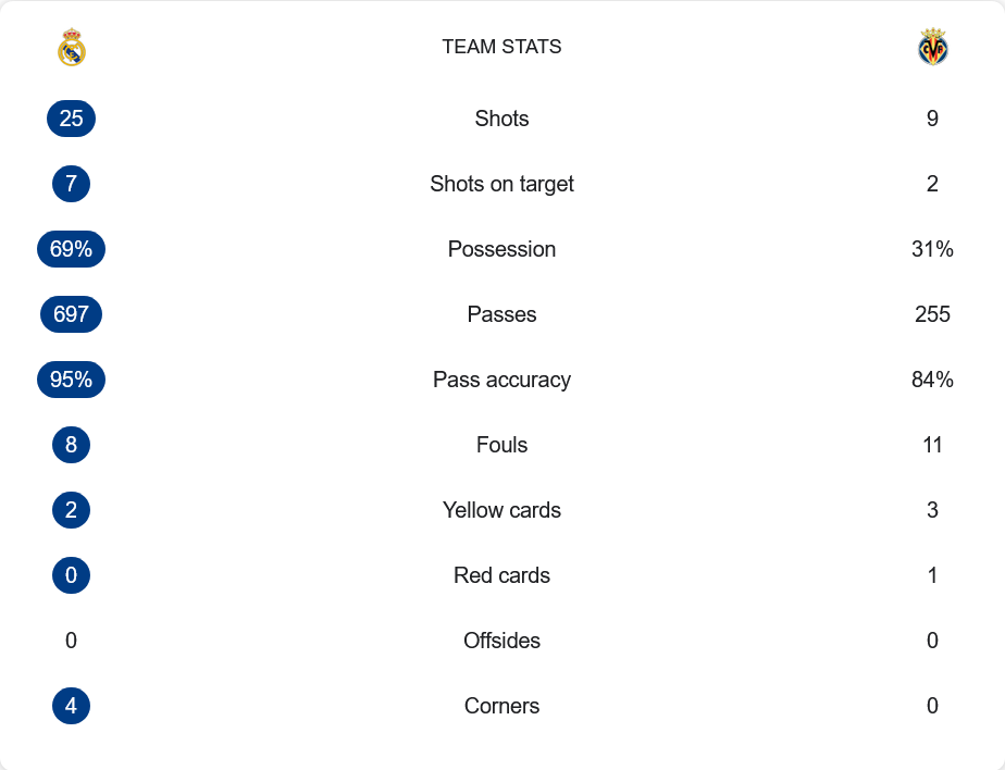 เรอัล มาดริด เหนือกว่าอย่างชัดเจน ทั้งจำนวนยิง 25 ครั้ง เข้ากรอบ 7 ครองบอล 69% จ่ายบอล 697 ครั้ง ความแม่นยำ 95% ขณะที่ บียาร์เรอัล ยิงได้เพียง 9 ครั้ง เข้ากรอบ 2 ครองบอล 31% จ่ายบอล 255 ครั้ง ความแม่นยำ 84% เกมนี้เจ้าถิ่นทำฟาวล์เพียง 8 ครั้ง ใบเหลือง 2 ส่วนทีมเยือนโดนถึง 11 ฟาวล์ ใบเหลือง 3 ใบ และใบแดง 1