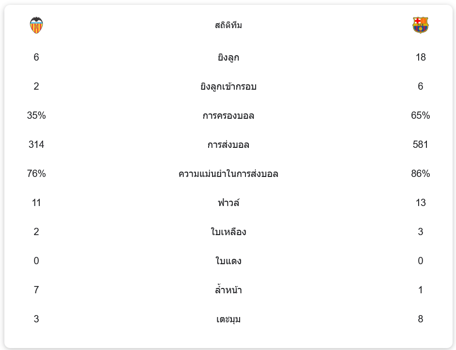 บาเลนเซีย มีการยิงทั้งหมด 6 ครั้ง เข้ากรอบ 2 ครั้ง และครองบอลได้ 35% ด้วยการส่งบอลทั้งหมด 314 ครั้ง ความแม่นยำในการส่งบอลอยู่ที่ 76% พวกเขาทำฟาวล์ทั้งหมด 11 ครั้ง ได้รับใบเหลือง 2 ใบ และไม่มีใบแดง ได้เตะมุม 3 ครั้ง