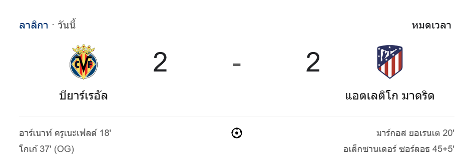 การแข่งขันที่แฟนบอลทุกคนเฝ้ารอในศึก ลาลิกา 2024 ระหว่าง บียาร์เรอัล กับ แอตเลติโก้ มาดริด จบลงด้วยผลเสมอ 2-2 ที่สนามของบียาร์เรอัลเมื่อคืนนี้ การแข่งขันครั้งนี้เต็มไปด้วยความตื่นเต้นและการสู้กันอย่างดุเดือดระหว่างทั้งสองทีม