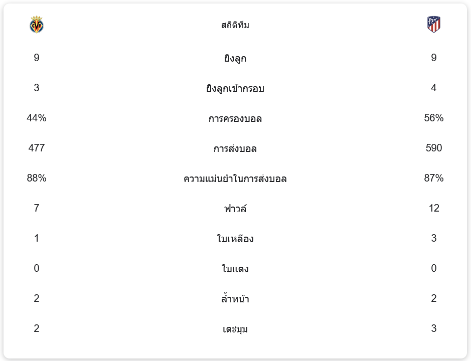 การแข่งขันนี้แสดงให้เห็นถึงความเท่าเทียมกันของทั้งสองทีม ด้วยจำนวนการยิงที่ใกล้เคียงกันที่ บียาร์เรอัล ยิง 9 ครั้งและ แอตเลติโก้ มาดริด ยิง 9 ครั้งเช่นกัน แม้ แอตเลติโก้ มาดริด จะครองบอลได้มากกว่า 56% แต่ บียาร์เรอัล ก็แสดงให้เห็นถึงการป้องกันที่แข็งแกร่งและสามารถรับมือกับการบุกได้อย่างดี โดยเฉพาะความแม่นยำในการส่งบอลที่สูงถึง 88% นอกจากนี้ทั้งสองทีมยังต้องเผชิญกับการฟาวล์หลายครั้งและได้รับใบเหลืองกันหลายใบ ซึ่งเป็นเครื่องยืนยันถึงความเข้มข้นของเกม