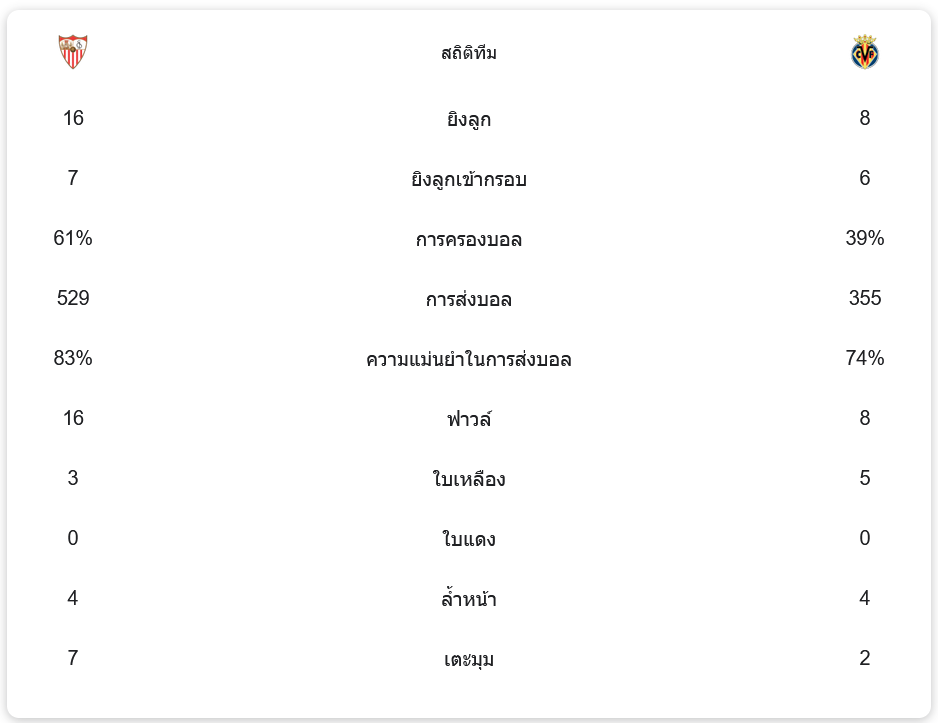 - จำนวนการส่งบอล: เซบีย่า 529 ครั้ง (ความแม่นยำ 83%), บียาร์เรอัล 355 ครั้ง (ความแม่นยำ 74%)
