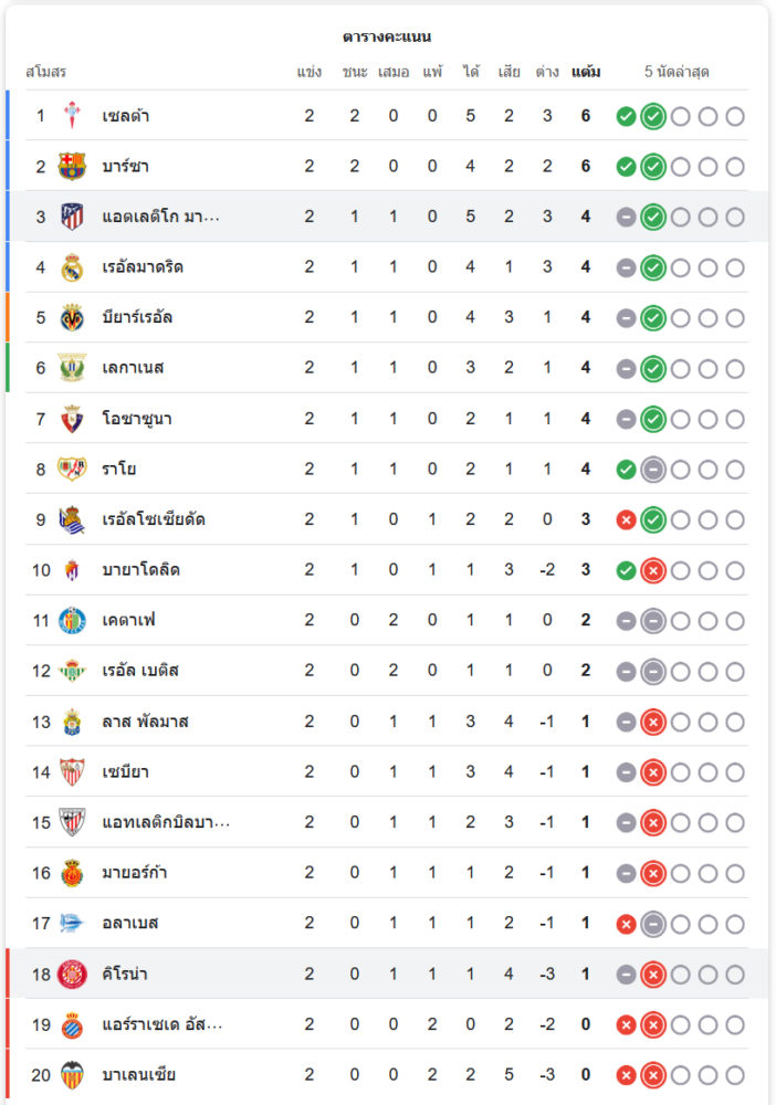 ด้วยผลการแข่งขันนี้ แอตเลติโก้ มาดริด ขยับขึ้นมาอยู่อันดับที่ 3 ของตารางคะแนนลาลิกา มี 4 คะแนนจากการลงเล่น 2 นัด ขณะที่คิโรน่า อยู่อันดับที่ 18 ของตาราง มีเพียง 1 คะแนนจากการลงเล่น 2 นัด